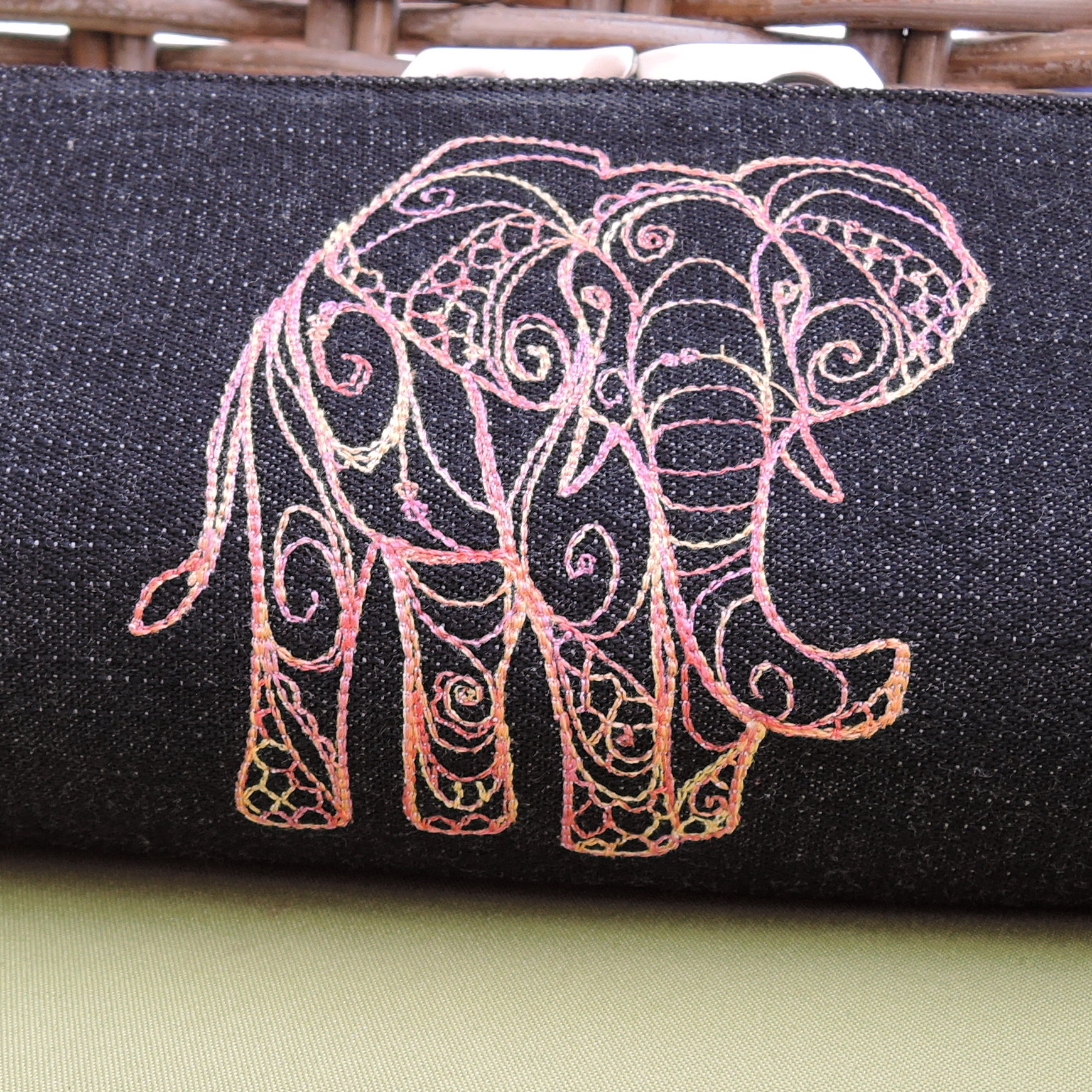Látka černá riflovina, ozdobená strojovou všivkou. Velikost taštičky je 18 x 10 cm. Z kolekce denim-black